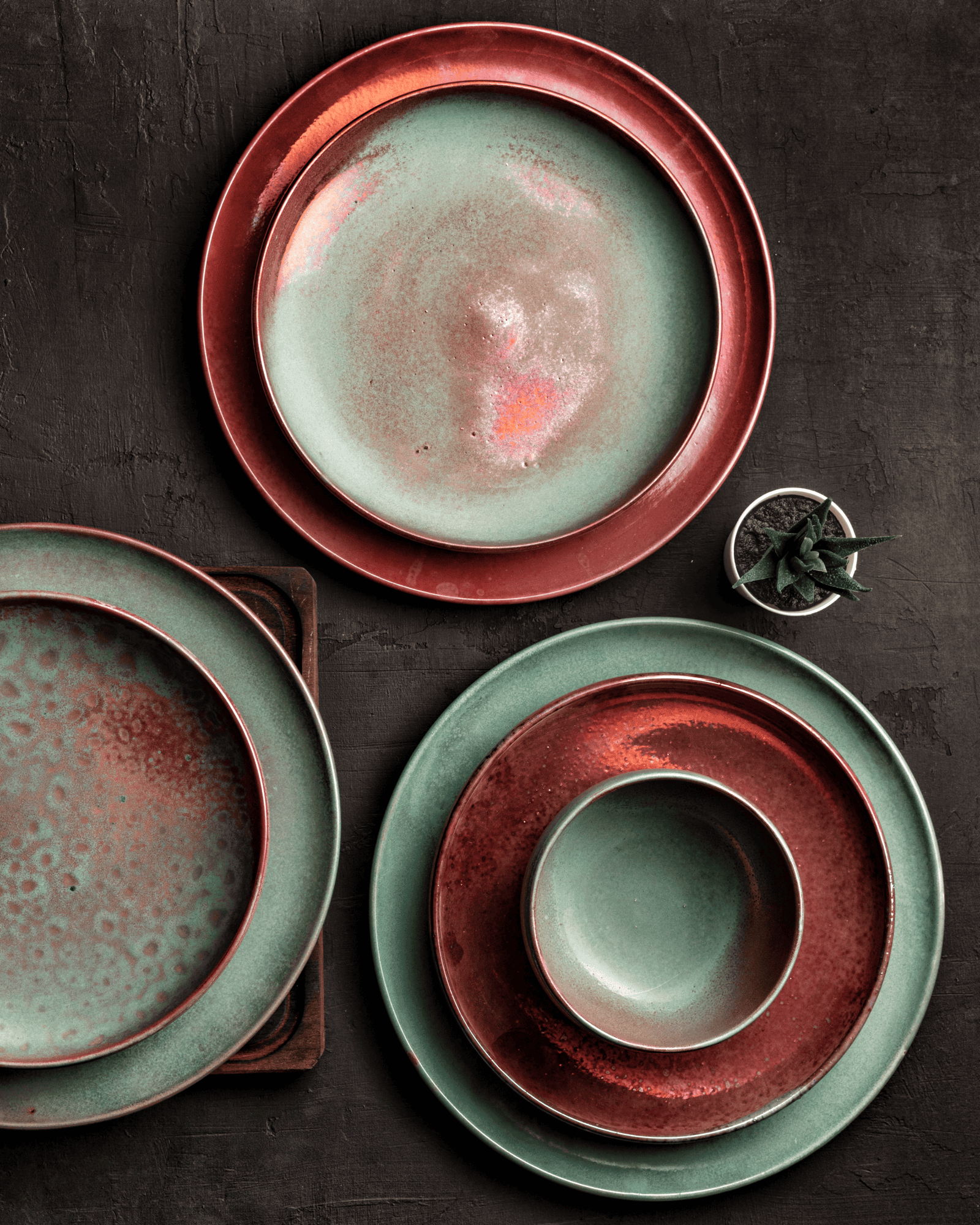 Inspired by the meeting of earth and water, the Copper Sea Dinner Set combines the warm shimmer of metallic bronze with the calming depth of teal. Each handcrafted piece tells a story of contrast—bold yet harmonious, refined yet grounded.